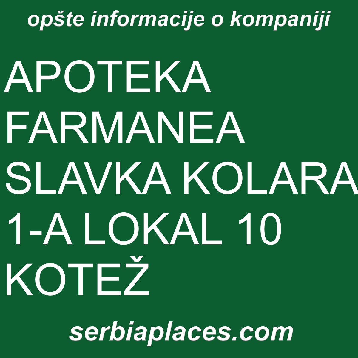 Opšte informacije o kompaniji APOTEKA FARMANEA SLAVKA KOLARA 1-A LOKAL 10 KOTEŽ